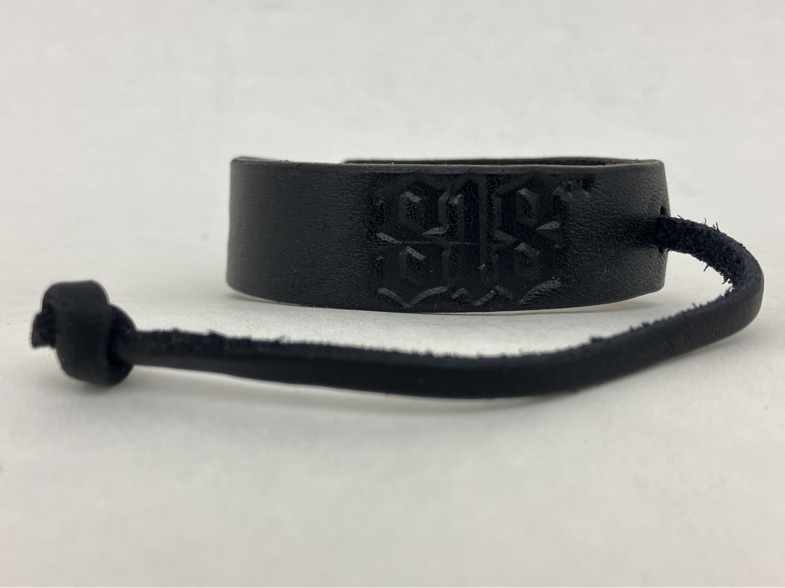 Classic hippie style no-hardware bracelet. Adjusts to fit any size wrist. 3/4 inch wide black leather with strong black latigo string.